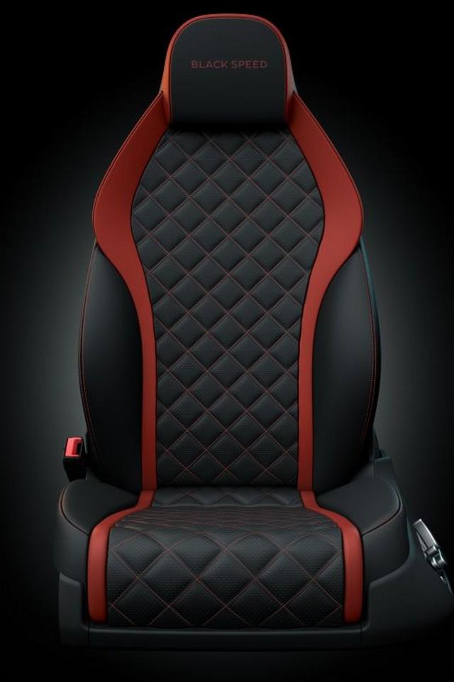 Il resto degli interni è sempre all’insegna del lusso, anche i sedili in pelle lasciano spazio al rosso: dalla seduta si estendono due linee fino al poggiatesta, dove è presente la scritta “Black Speed”, sempre di colore rosso.