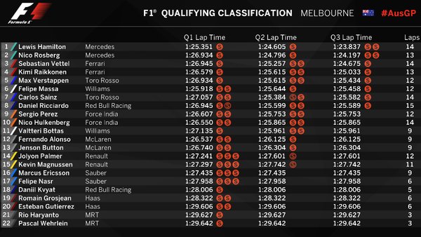Un inizio di stagione emozionante. Nota di merito a Nico Rosberg, che è riuscito ad essere costante durante tutto il weekend crescendo sessione dopo sessione, portando a casa la prima posizione. Peccato per la Scuderia Ferrari, il passo gara è ottimo, ci resta da chiedersi come sarebbe andata la gara senza l’incidente di Alonso…..