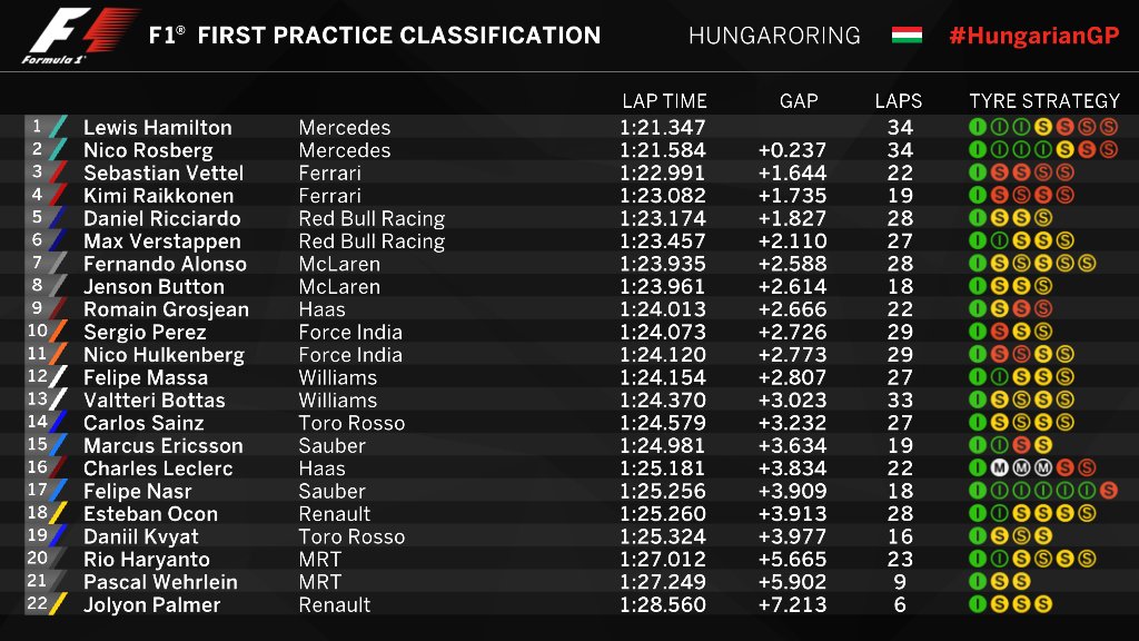Raikkonen invece ha mostrato diversi problemi chiudendo sesto dietro ad Hamilton, che però non ha concluso il suo giro veloce e davanti ad un arrembante Fernando Alonso. Sul circuito ungherese la McLaren-Honda sembra essere molto più vicina ai primi, almeno in questa prima parte del week-end, come testimonia anche l’8° posizione di Button in FP2.