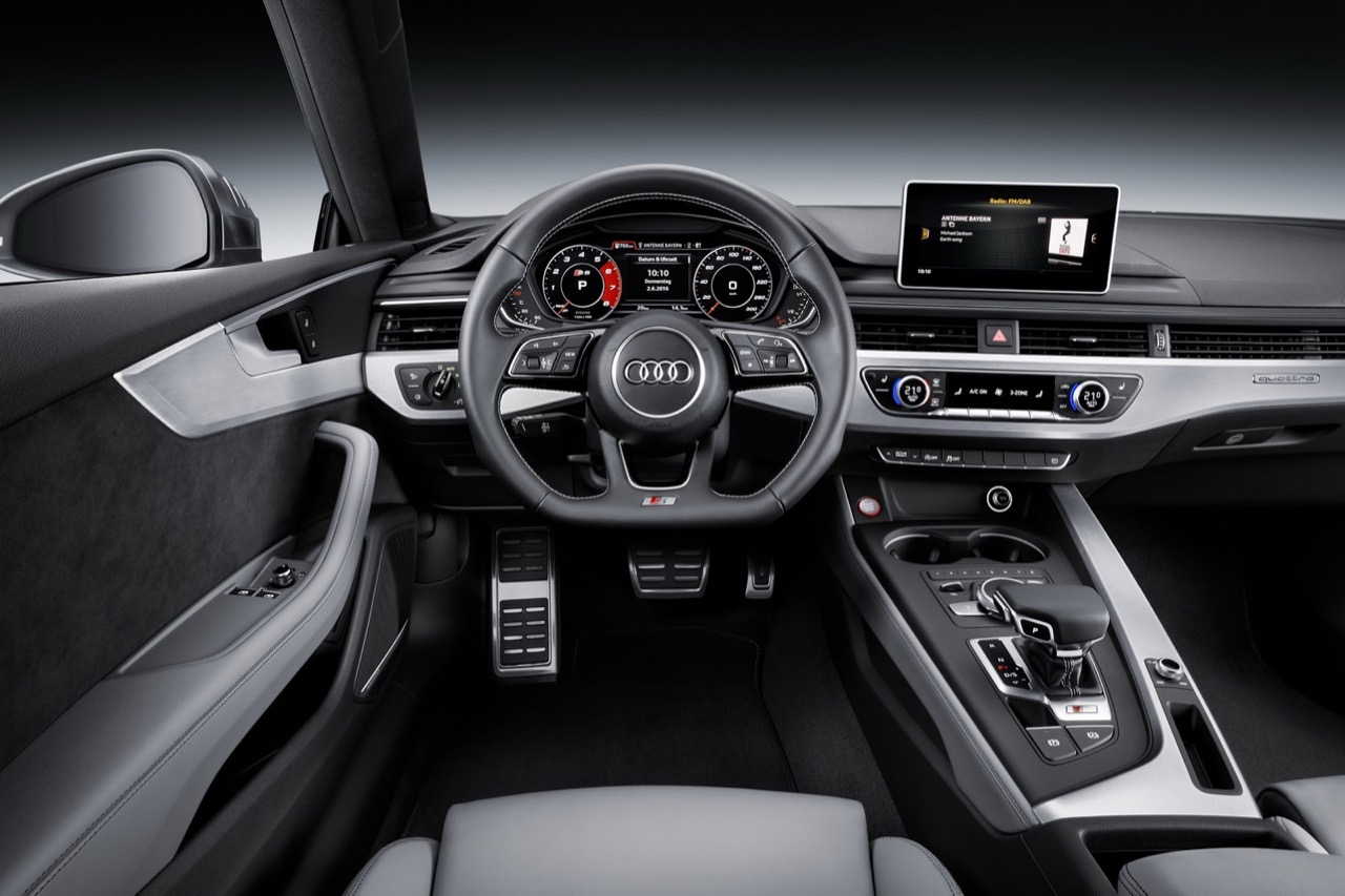 Il posteriore è caratterizzato dalla stessa filosofia di design, accompagnando lo sguardo a posarsi sugli interni attraverso il lunotto posteriore: l’abitacolo è arricchito da inserti metallici ben curati e vari elementi realizzati in materiali di qualità ed eleganza, il tutto volto ad accentuare la sensazione di sportività offerta dalle versioni più performanti. Anche il contenuto tecnologico è ben organizzato e corposo, capitanato dall’ormai onnipresente Audi Virtual Cockpit, che troviamo accompagnato da un ulteriore schermo di infotainment, che torreggia sulla plancia integrato in una soluzione semplice ma al contempo elegante. L’abitacolo della S5, come ci ricorda quella S nella sigla, è inoltre ancora più sportivo ed aggressivo, contrapponendosi alla sensazione di comfort che trasmettono le altre versioni.